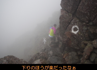 ところどころ「登りコース」と「下りコース」の混ざり合うところで道の譲り合いになるが、順調に下ることができ、15分ほどで小屋に到着。 下りはちょっと苦労するかと思ったけれど、お尻を付くつもりで下ればいとも簡単に降りられてしまった。 悲願の『槍ヶ岳』登頂を終え、あとは『新穂高温泉』へ下るのみ。 靴下と中敷が乾いているので、靴が多少湿っていても足が濡れてふやけることはなく一安心。 濡れたテントが入っているザックの重さにも慣れ、昨日苦労した『千丈沢乗越』までの下りも苦にならなくなってきている。 ザックが体の一部になったと感じる時がきた。 この感覚が1日目からあればなぁ〜、たいてい4日目くらいからなんだよね。 下るごとに空には青空が広がり、陽が差しはじめたけれど、『槍ヶ岳』山頂付近にはずっと雲がかかっていて、まだまだ展望はなさそうだ。