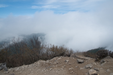 カップラーメンを用意していたけれどお湯を沸かす鍋を忘れちゃった。 下山までの約2時間程度ならおにぎりとパン半分(半分は非常食)でお腹は持つだろう。 『駒ケ岳』までは晴れていれば『富士山』が見えるほどの展望の良い登山道らしいが、霧が晴れずになにも見えない。 ![]() たまに水滴が落ちてポツポツと地面が鳴るけれど、雨が降っている感じではなく、たぶん霧で濡れた木の葉に水分が溜まり、風に揺られて水滴となって落ちているみたい。 『黒檜山』山頂よりも狭いせいか『駒ケ岳』山頂は大混雑、こんなに登山者いたんだと思うほど。 展望は良くないし 「長居は無用」 と駐車場までノンストップ。 長い木の階段の下りが続き 「こっち側からの登りはきついだろうな」 と思えるような急斜面が続く。