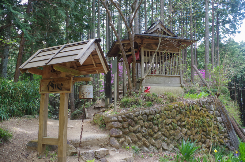 あちらこちらに咲いているツツジや日に照らされた若葉の写真を撮りながら30分ほどして、桜とスミレの花の色で彩られた『北向地蔵』に到着。